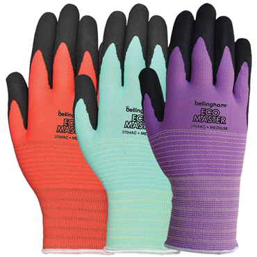 Bloom Spandex Garden Gloves (Colors Vary)$15.99Bond Bloom Lightweight Gardening Gloves. Assorted Colors: Blue, Green, Purple (Sold Separately) Great for simple gardening. Synthetic leather palm. Stretch spandex for a comfortable fit. Preloaded on a clip strip. In the notes section of your shopping cart, let us know which color you'd like. | WONDER GRIP LIQ PRF LTX GLV Xxl$12.99WONDER GRIP LIQ PRF LTX GLV Xxl | BHAM ECO MASTER LRG GLV AST$8.99Comfortable, hand-hugging 15-gauge polyester and spandex knit liner. Breathable, flexible, textured palm coat is made from eco-friendly water-based polymer polyurethane. Durable palm coat outperforms standard polyurethane coatings 4:1, compares to sandy finish nitrile coatings. Assorted colors: Purple, Red, and Mint Green. If you wish to specify the color you want, please leave a note in your shopping cart. |